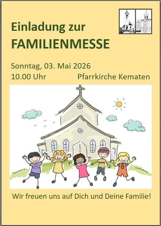 Pfarrkirche KematenSonntag: 10.00 UhrDonnerstag: 08.00 UhrSamstag: 18.30 Uhr - 1. und 3. Sa Hl. MesseWort-Gottes-Feier: 18.30 Uhr - 2. und 4. Sa |