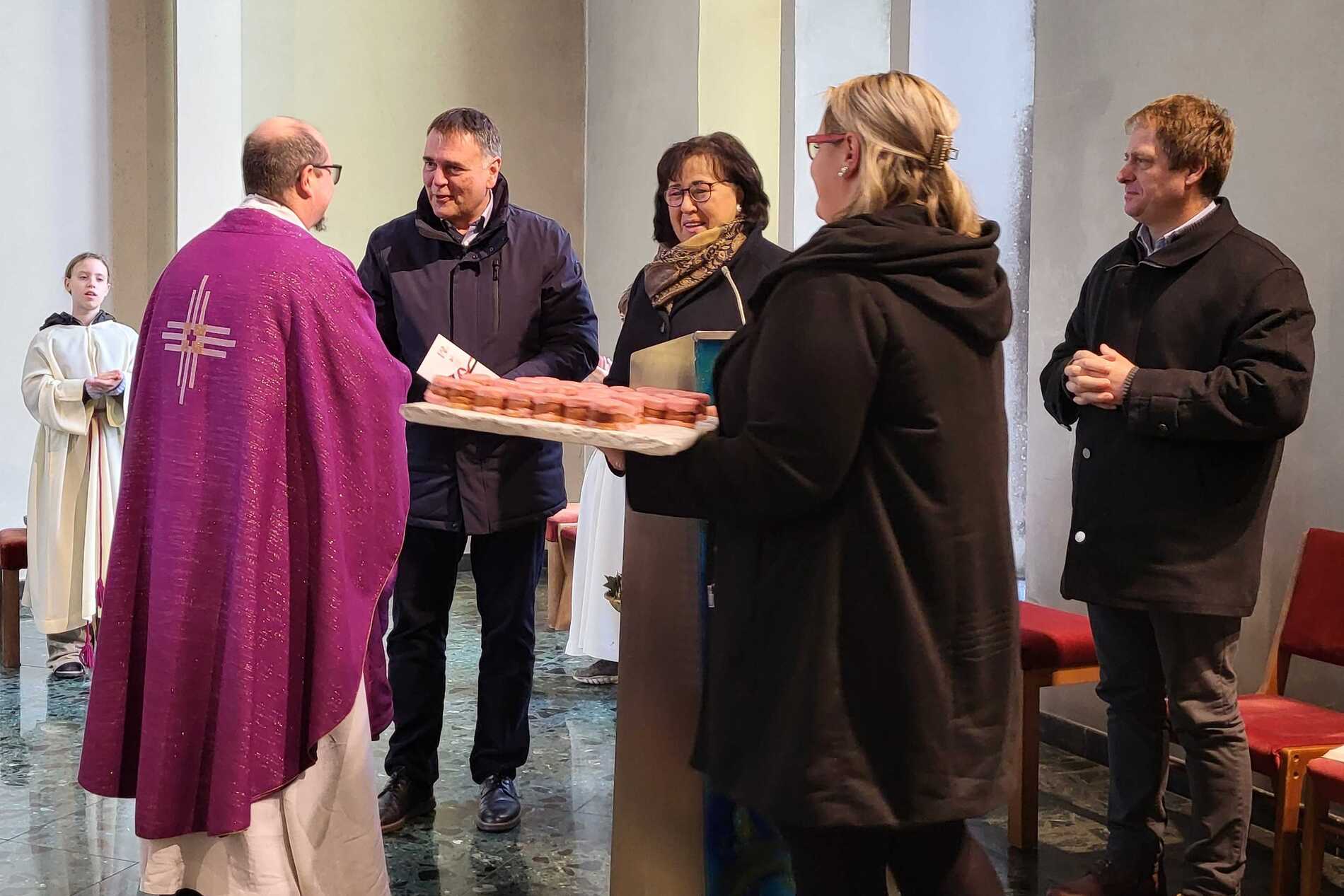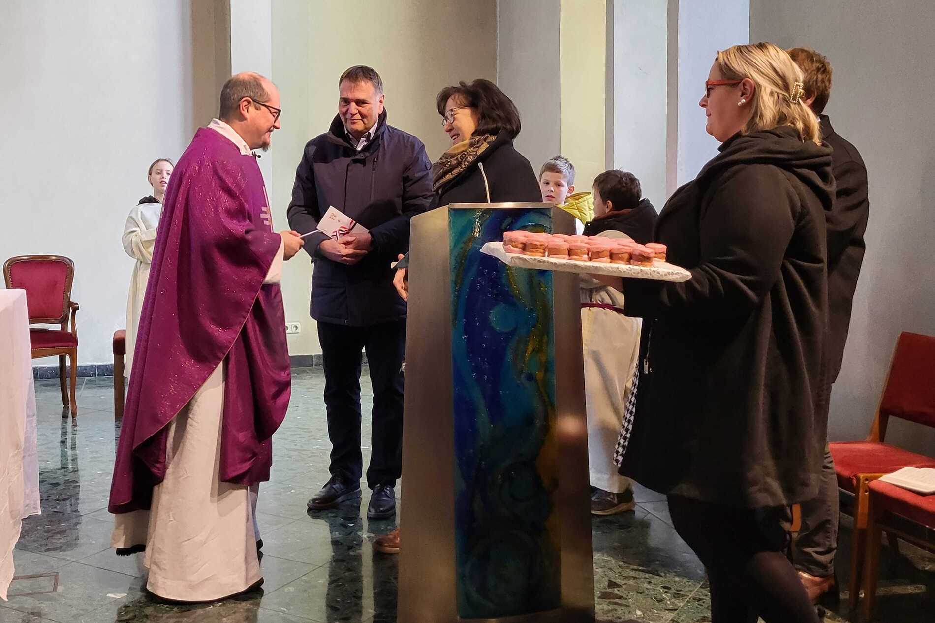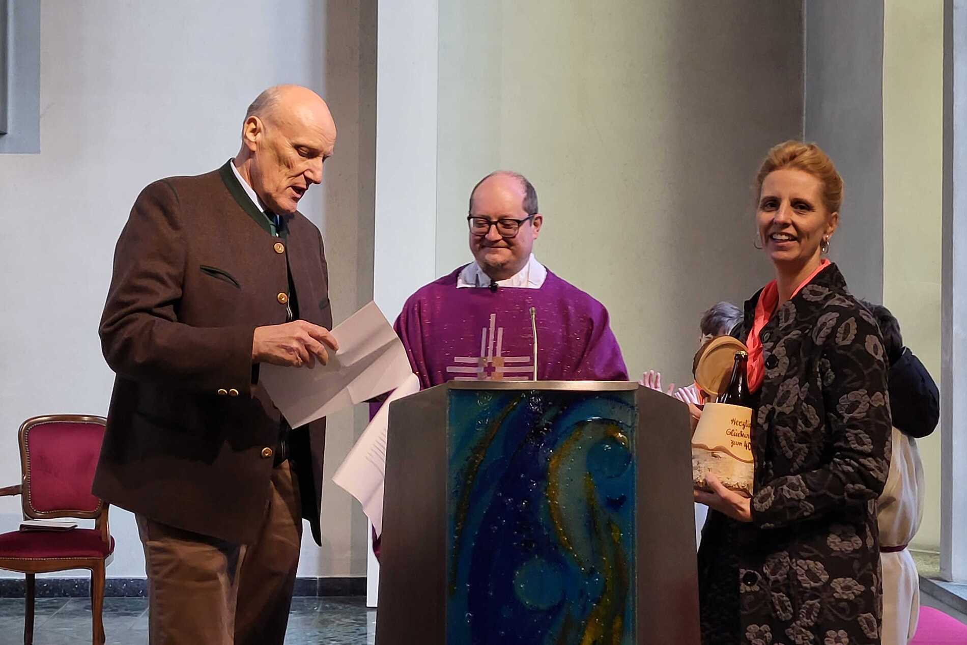 Am Ende des Gottesdienstes sorgte eine besondere Gratulation für viele herzliche Momente. Bürgermeisterin Juliane Günther und Bürgermeister Thomas Raidl überbrachten Glückwünsche und überreichten dem Jubilar einen „40er“ aus 40 liebevoll gestalteten Punschkrapfen – eine süße Überraschung, die P. Vitus besonders freute. Im Anschluss gratulierte auch der Pfarrkirchenratsobmann im Namen des Pfarrgemeinderates und überreichte dem Geburtstagskind einen Wertgutschein zum Skifahren, eine Aktivität, die P. Vitus sehr gerne ausübt.
