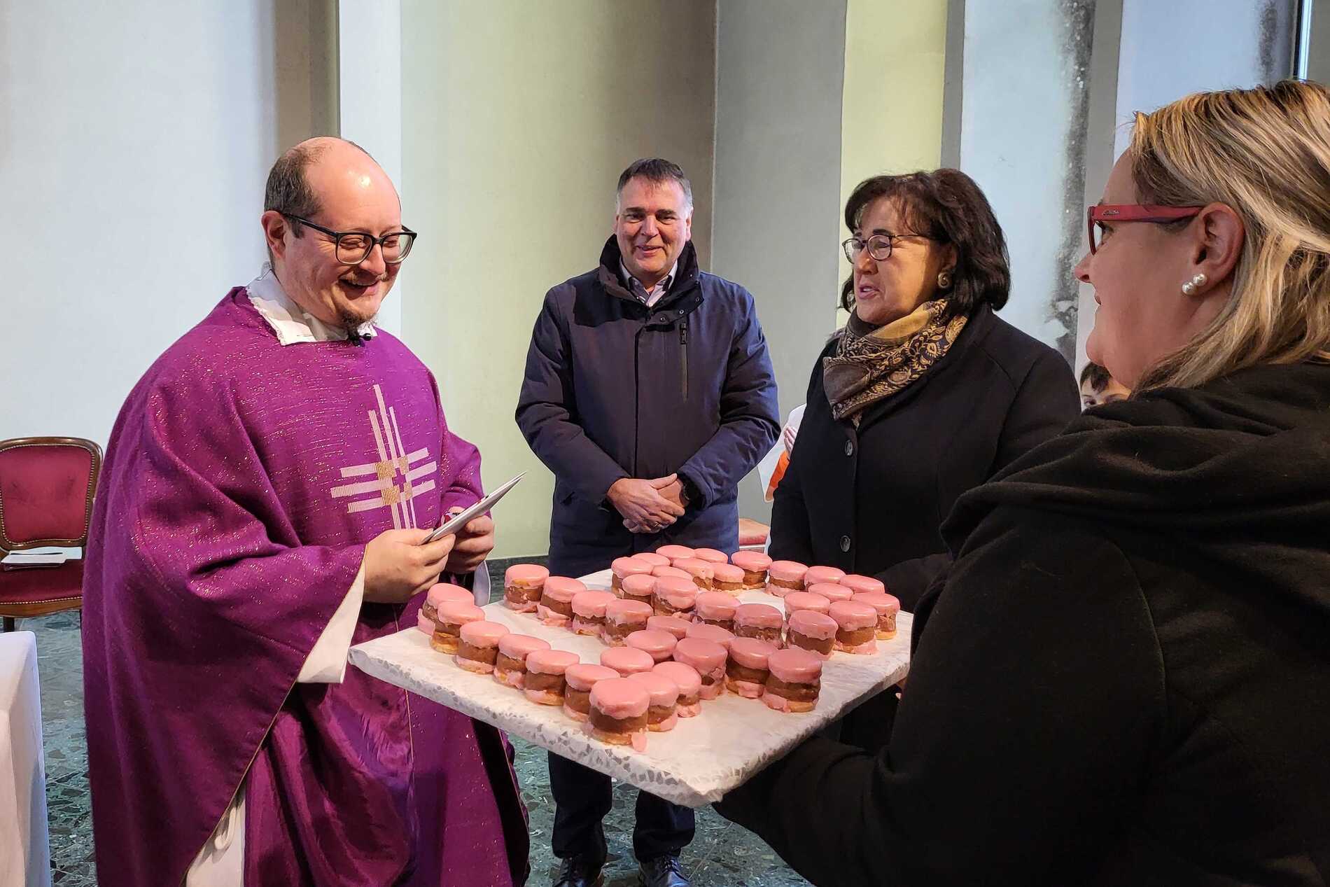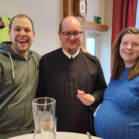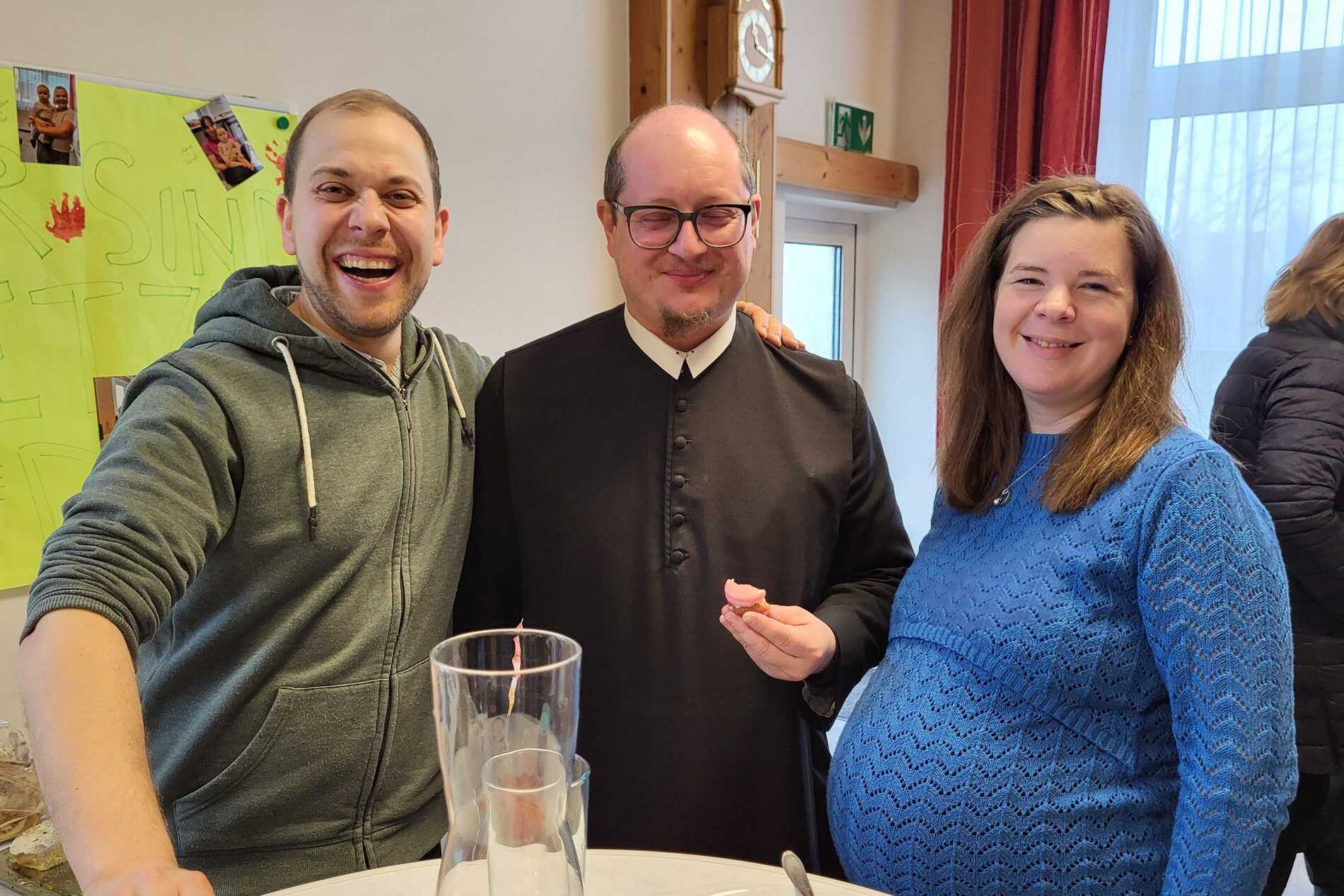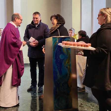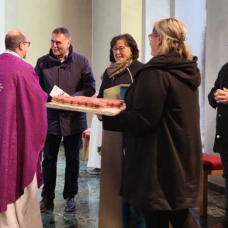 Am Ende des Gottesdienstes sorgte eine besondere Gratulation für viele herzliche Momente. Bürgermeisterin Juliane Günther und Bürgermeister Thomas Raidl überbrachten Glückwünsche und überreichten dem Jubilar einen „40er“ aus 40 liebevoll gestalteten Punschkrapfen – eine süße Überraschung, die P. Vitus besonders freute. Im Anschluss gratulierte auch der Pfarrkirchenratsobmann im Namen des Pfarrgemeinderates und überreichte dem Geburtstagskind einen Wertgutschein zum Skifahren, eine Aktivität, die P. Vitus sehr gerne ausübt.