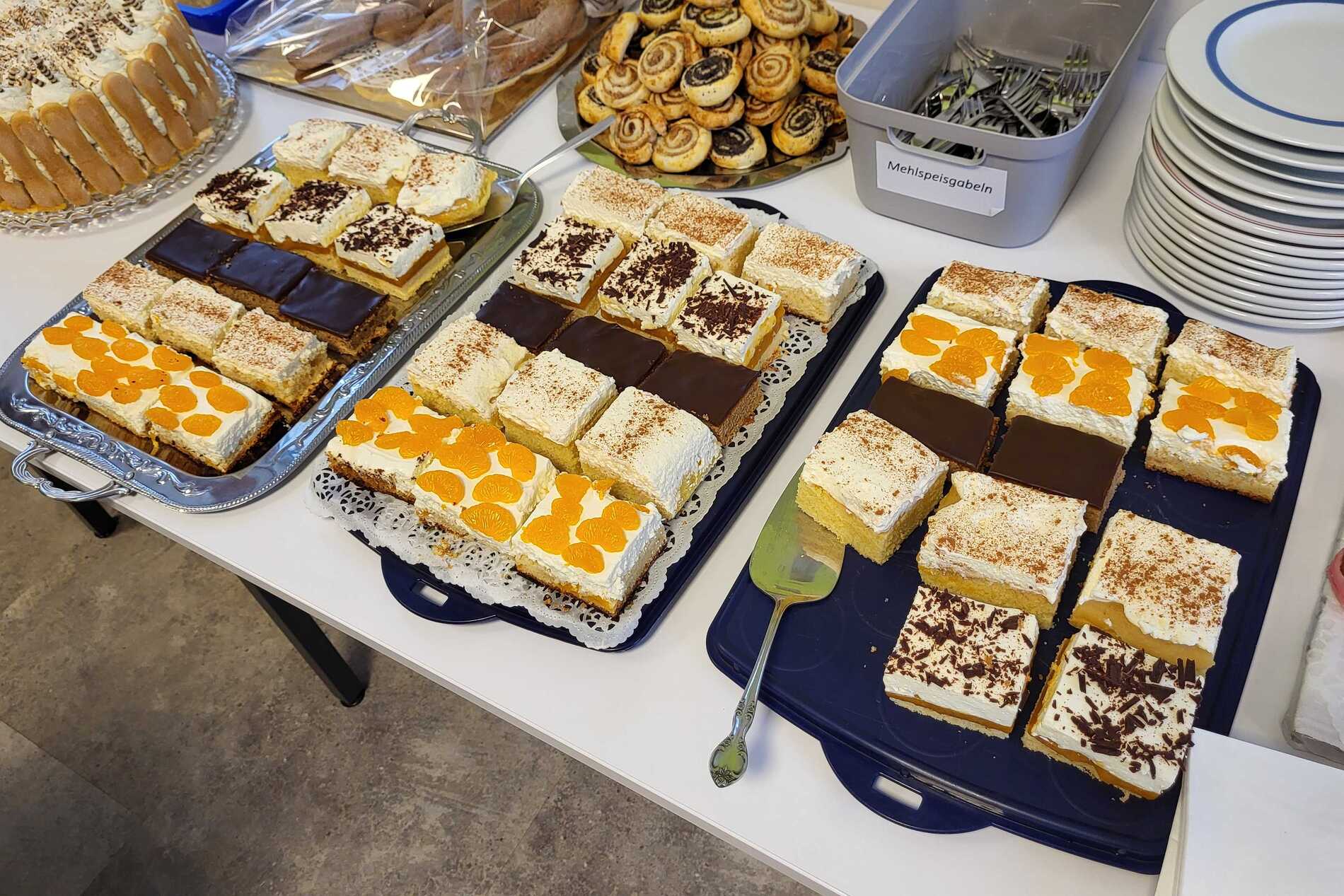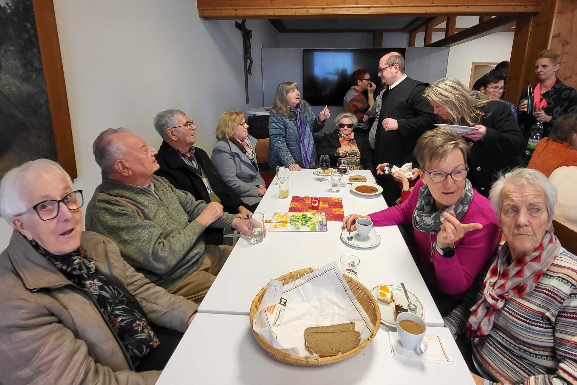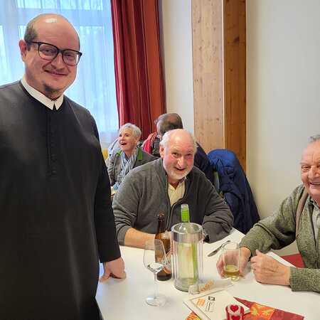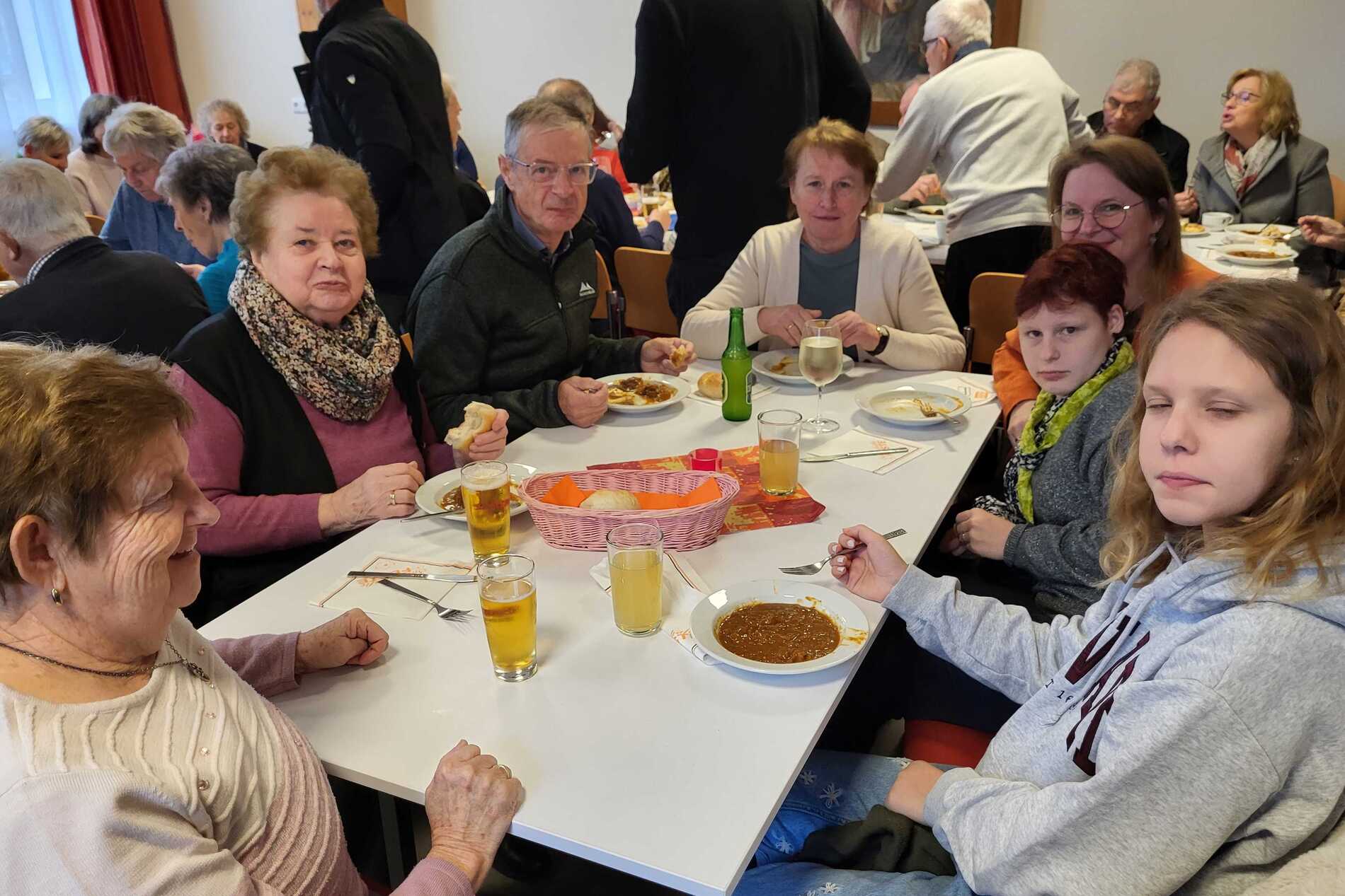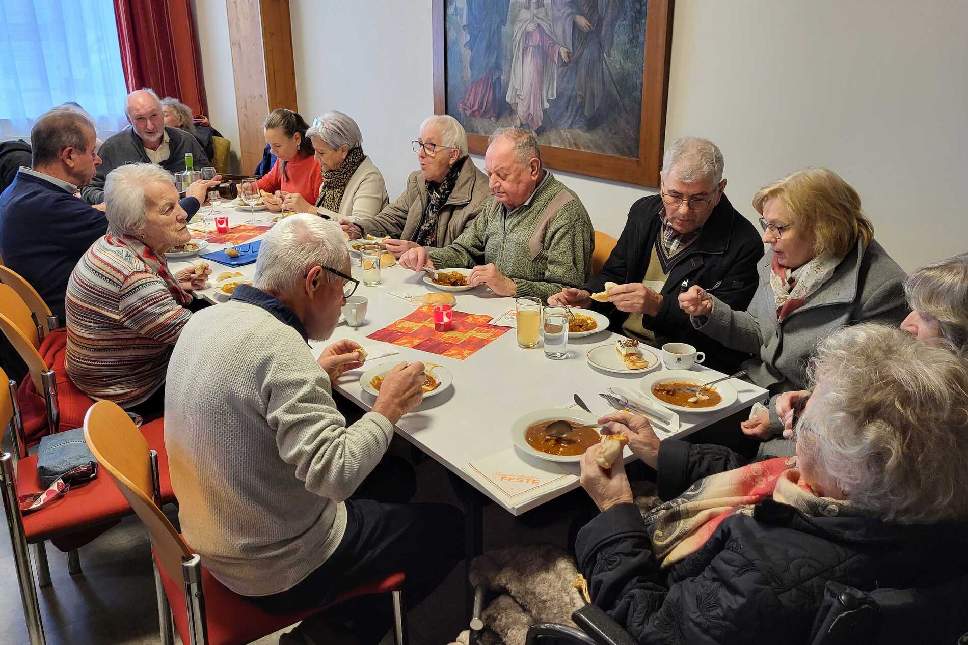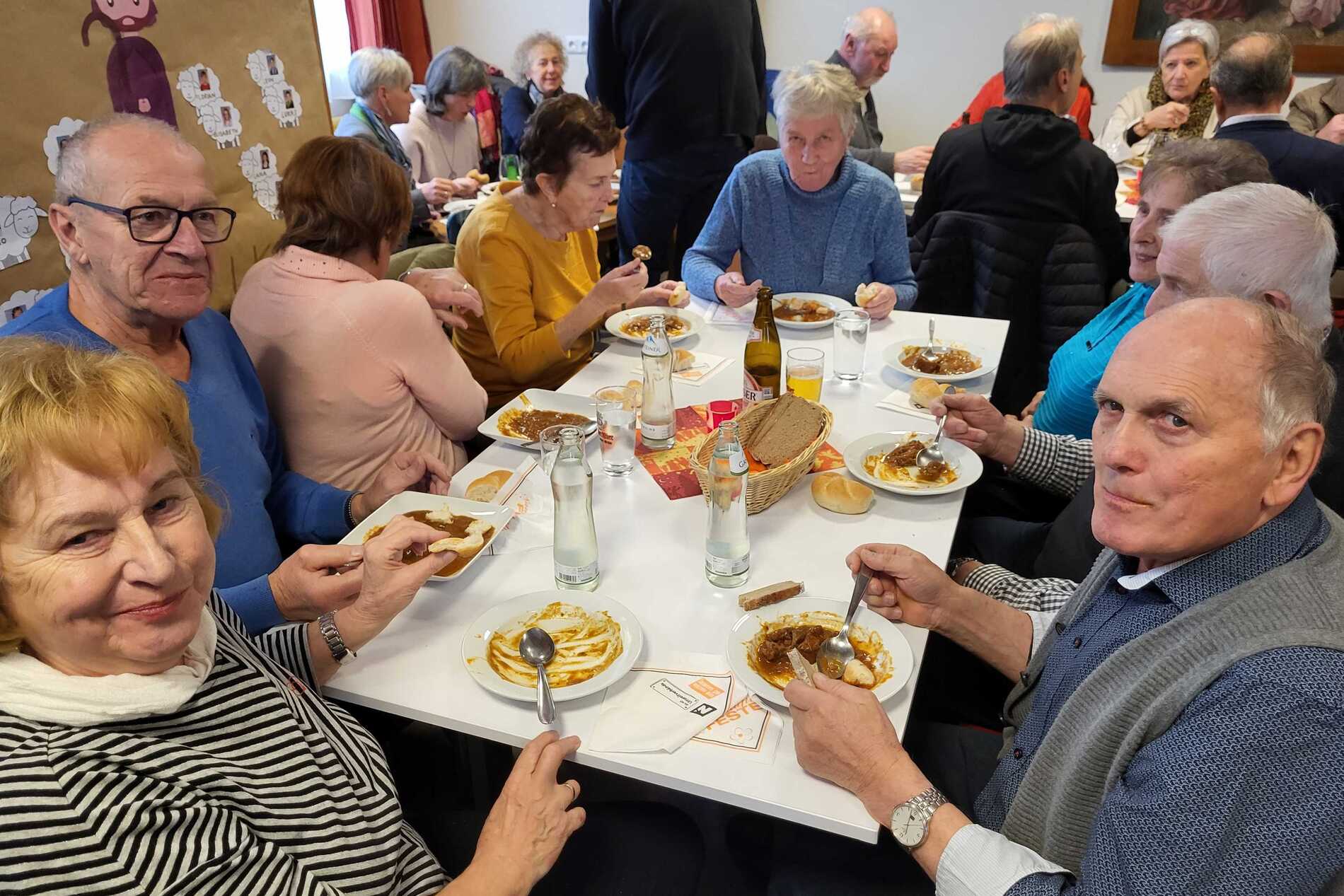 Nach dem Gottesdienst wurde zur Agape im Pfarrsaal geladen. Bei Gulasch, einer Auswahl an Getränken – von Wein und Bier bis hin zu Säften und Kaffee – sowie köstlichen Mehlspeisen kamen die Besucher miteinander ins Gespräch und genossen das gesellige Beisammensein.