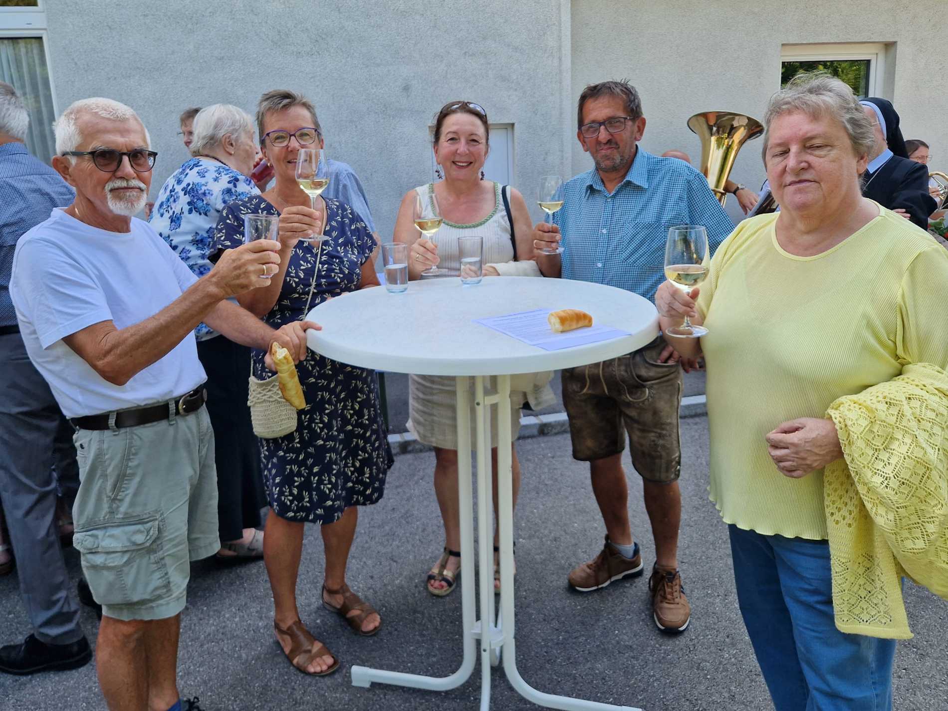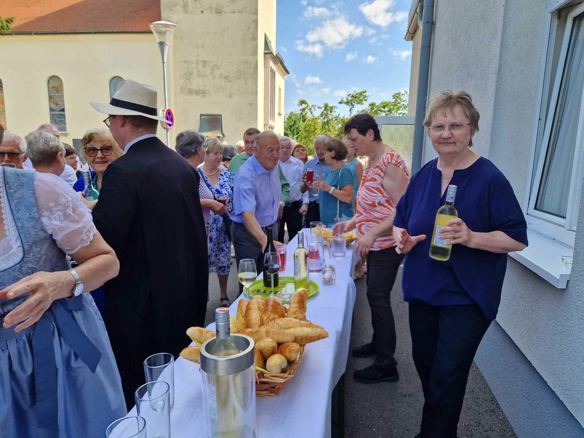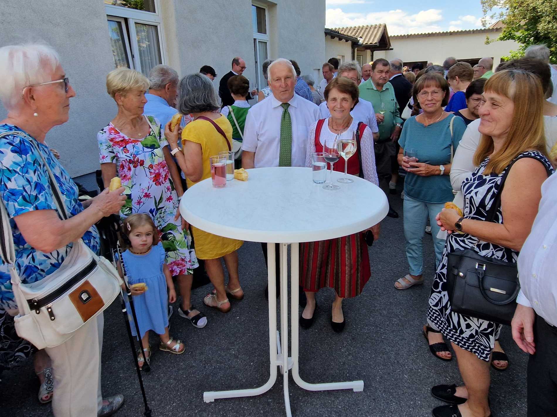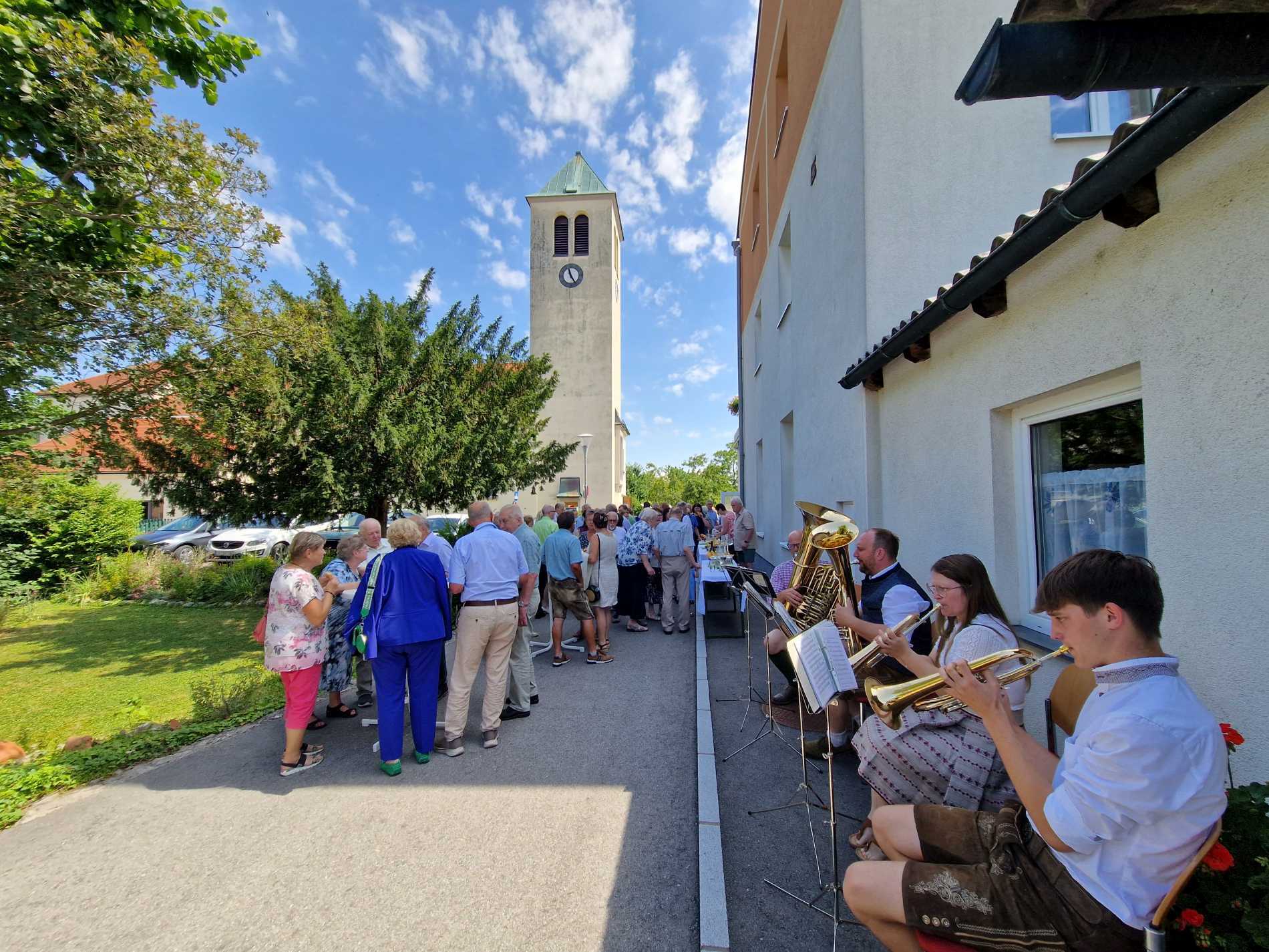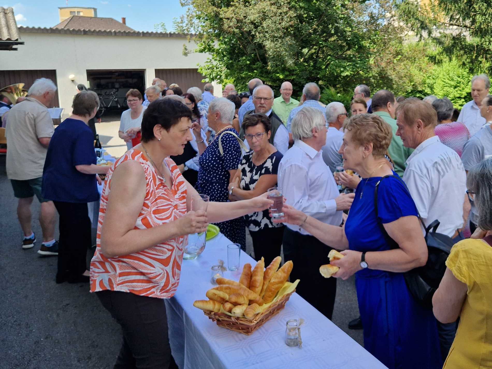 Nach der Messe lud der Jubilar zu einem gemütlichen Empfang, bei dem Briochkipferl, Wein und Saft gereicht wurden. Das Bläserensemble umrahmte die Veranstaltung musikalisch und sorgte für eine festliche Atmosphäre.