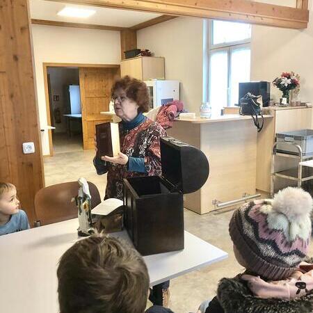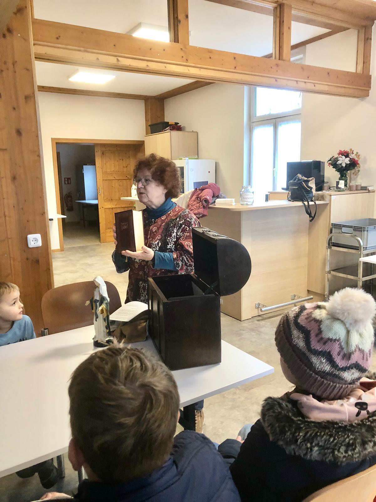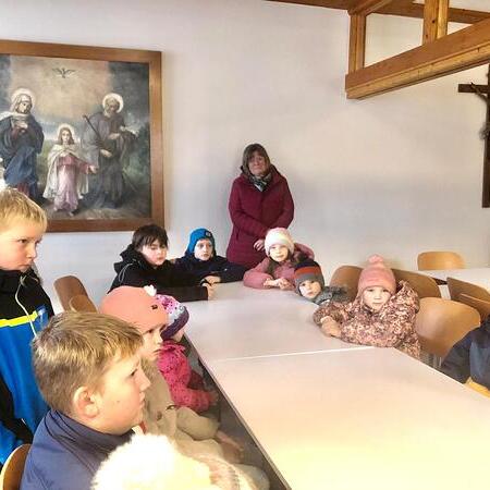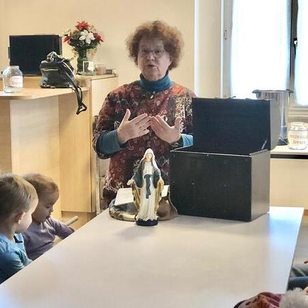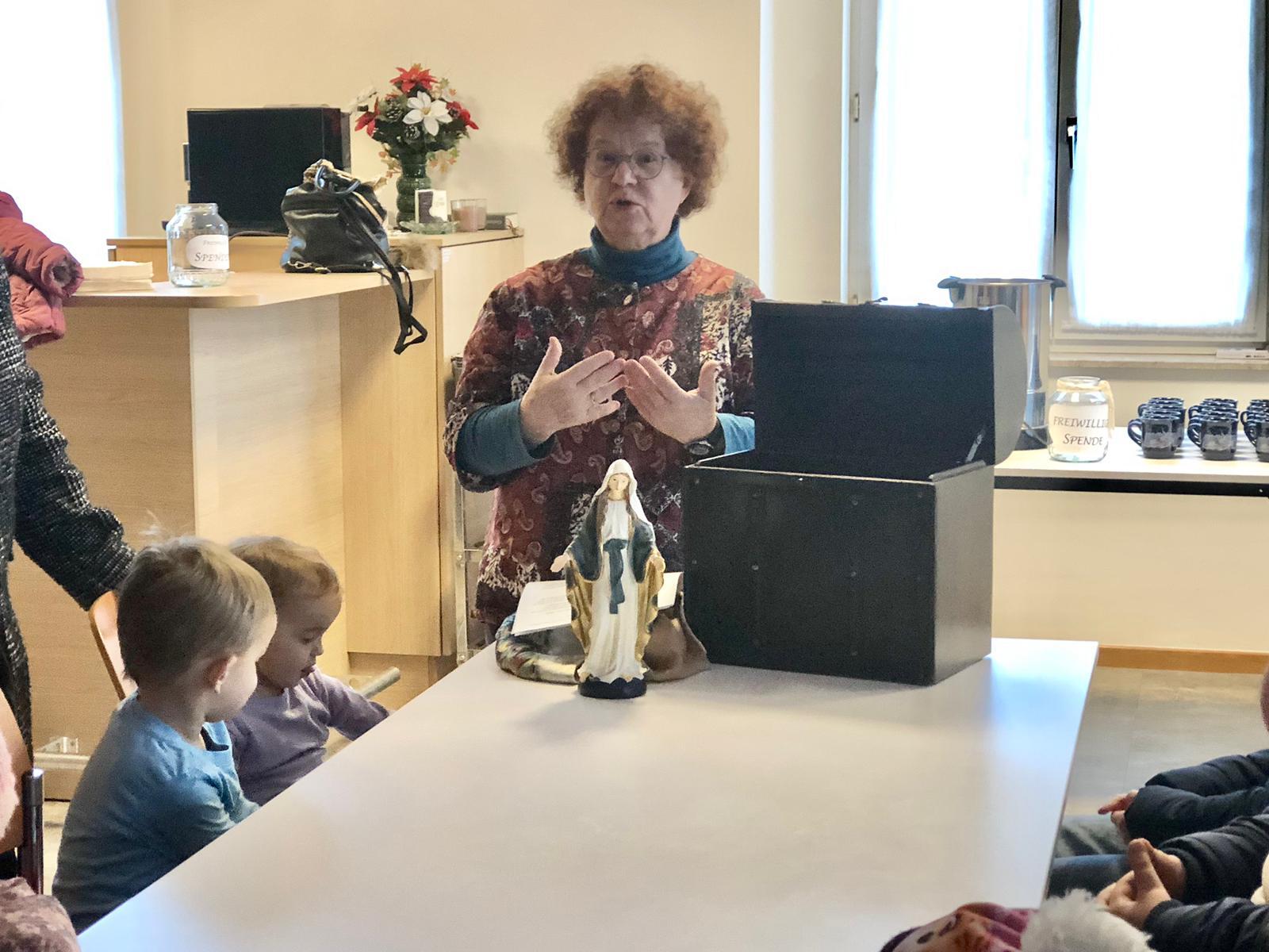 Während der Lesungen und der Predigt machten sich die Kinder gemeinsam mit ihrer Religionslehrerin Helga Hornbachner in den Pfarrsaal auf. Dort öffnete sie eine „Schatzkiste“, aus der sie eine Marienstatue hervorholte. In kindgerechter Weise erklärte sie, warum Maria ein besonderer Schatz Gottes ist. Als Erinnerung erhielten die Kinder einen kleinen Schatzstein, der sie an den Gruß an Maria erinnern soll: