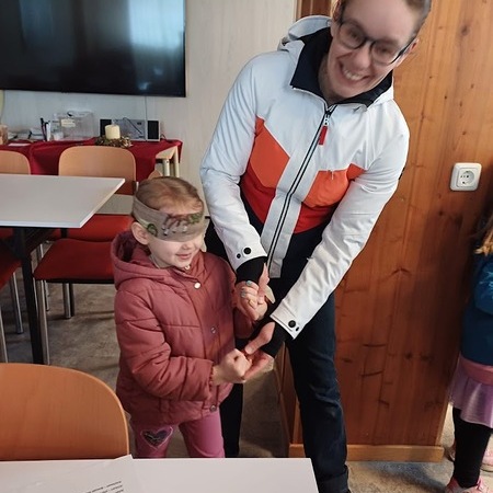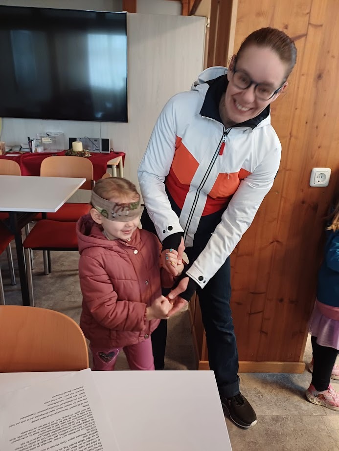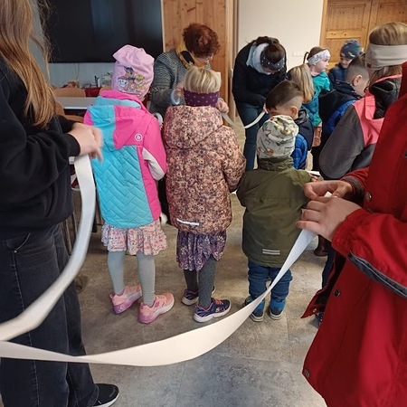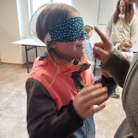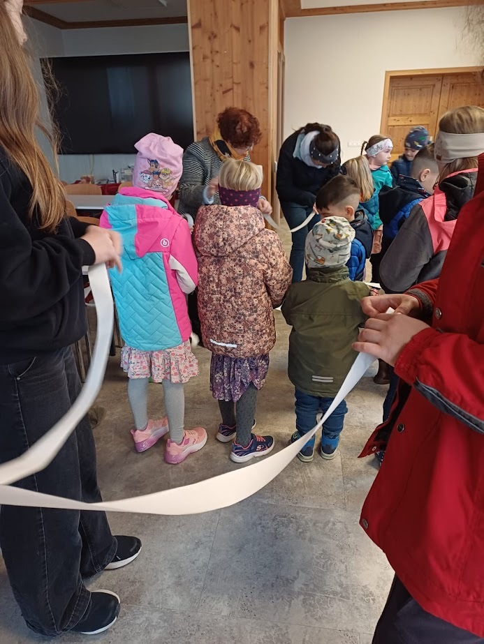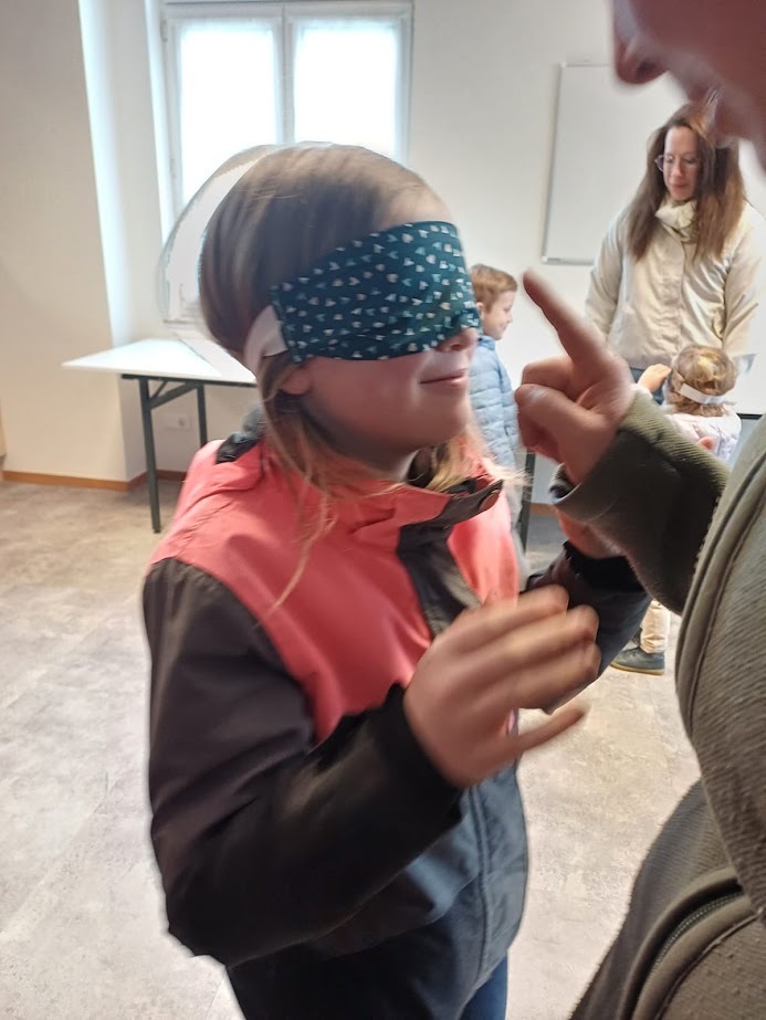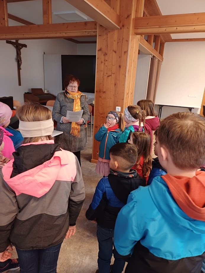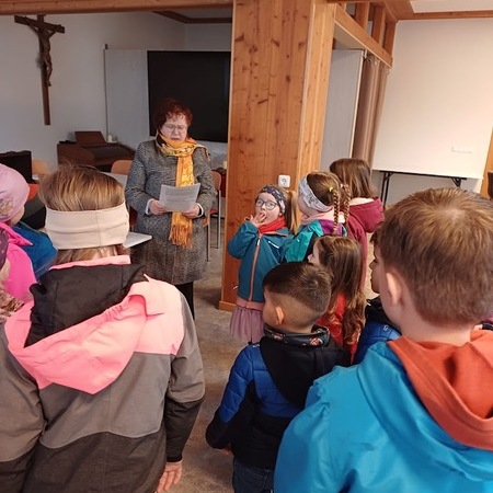 Im Pfarrsaal hörten die Kinder zuerst in einer kurzen Version des Evangeliums zum Sonntag Laetare vom Blindgeborenen, der von Jesus geheilt worden war, danach durften sie mit den Augenbinden ausprobieren, wie es ist, nichts zu sehen. Geführt von Freund oder Mutter fanden sie sich trotzdem zurecht, stellten aber fest, dass es viel besser ist, wenn man etwas sieht.